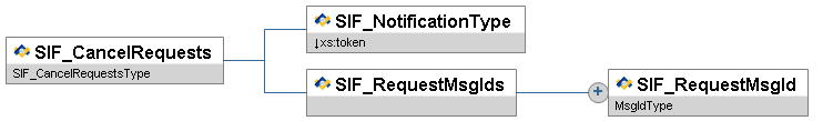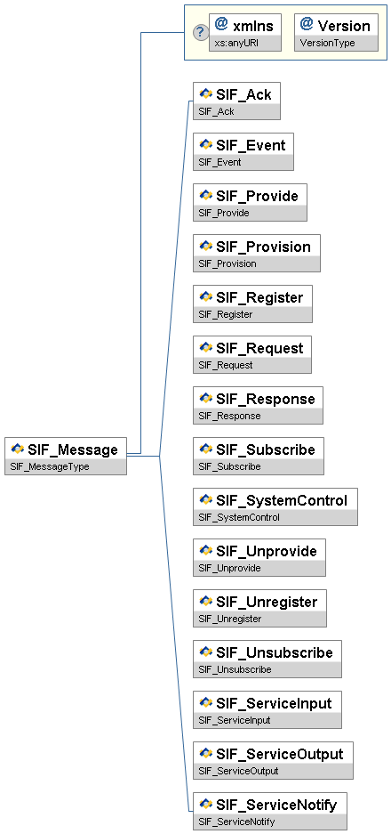 | SIF_Message | Contains one of the SIF message types. | choice of: SIF_Ack SIF_Event SIF_Provide SIF_Provision SIF_Register SIF_Request SIF_Response SIF_Subscribe SIF_SystemControl SIF_Unprovide SIF_Unregister SIF_Unsubscribe SIF_ServiceInput SIF_ServiceOutput SIF_ServiceNotify | ||