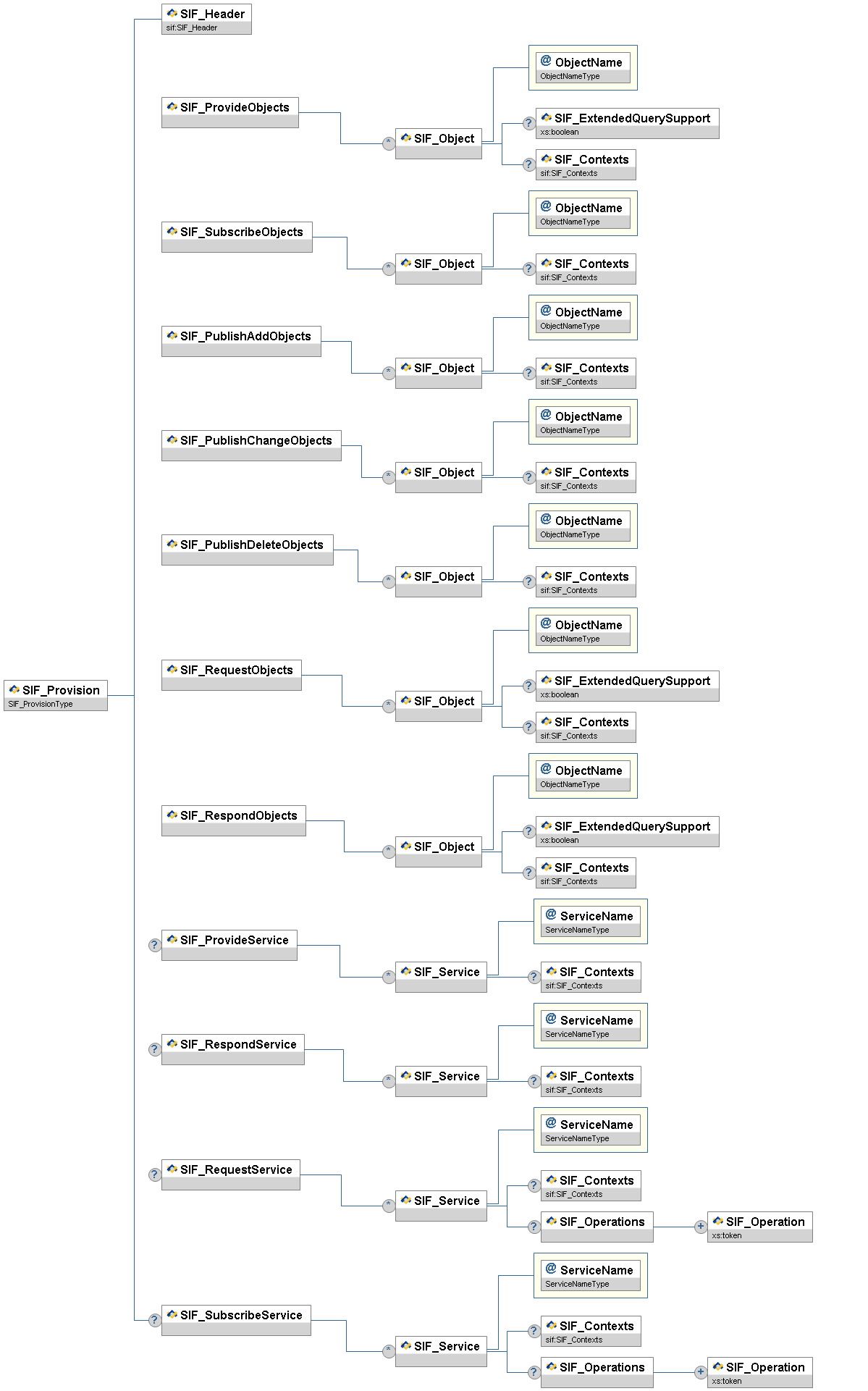 | SIF_ServiceProviders/SIF_ServiceProvider/ SIF_ServiceList/SIF_Service/ SIF_Contexts | O | Applicable contexts for stated SIF Zone Service support. If omitted, the context defaults to SIF_Default. | SIF_Contexts | |||