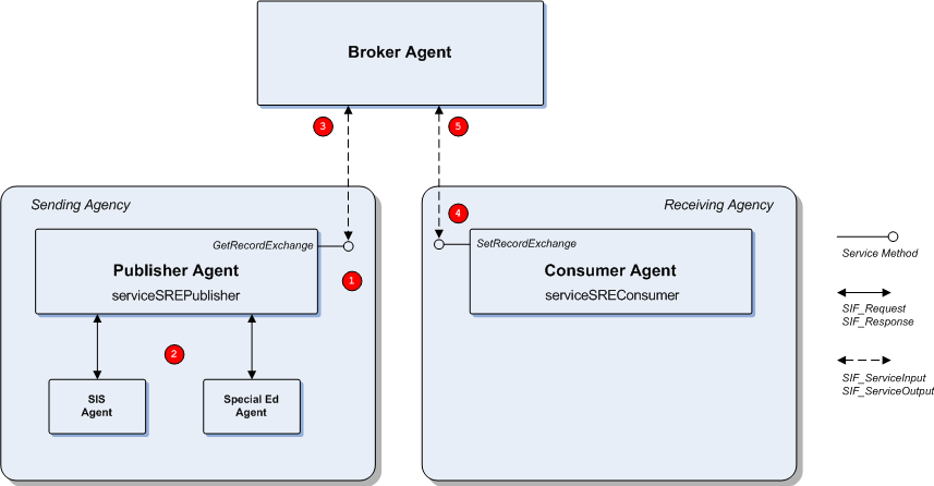 Figure 4 illustrates a requestor calling the GetRecordExchange service method of a broker agent, which implements the SRE Broker service (step 1). The broker then calls the GetRecordExchange service method of a publisher agent that implements the SRE Publisher service to obtain student records (step 2). The publisher agent issues SIF_Requests to its local zone to construct a StudentRecordExchange object set (step 3) or otherwise obtains the data according to its business rules. The results are returned back to the broker agent (step 4), and then back to the requestor (step 5).