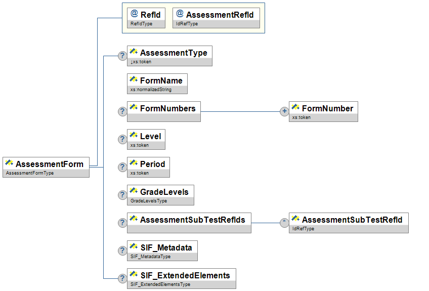 | @ | AssessmentFormRefId | M | The RefId of the assessment form used in the assessment administration. | IdRefType |