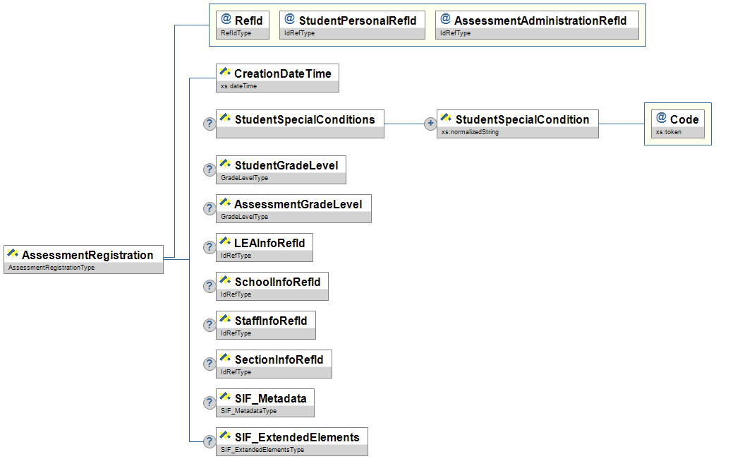 | @ | AssessmentAdministrationRefId | M | The assessment administration associated with the registration. | IdRefType |