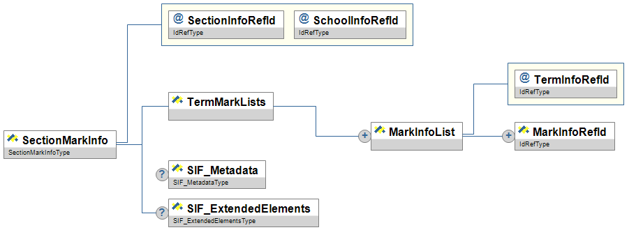 | SectionMarkInfo | This object defines the marking periods (TermInfo) that marks (StudentSectionMarks) are recorded in for a particular section (SectionInfo) and lists the types of marks (MarkTypeInfo) that are valid for that marking period (TermInfo). | |||