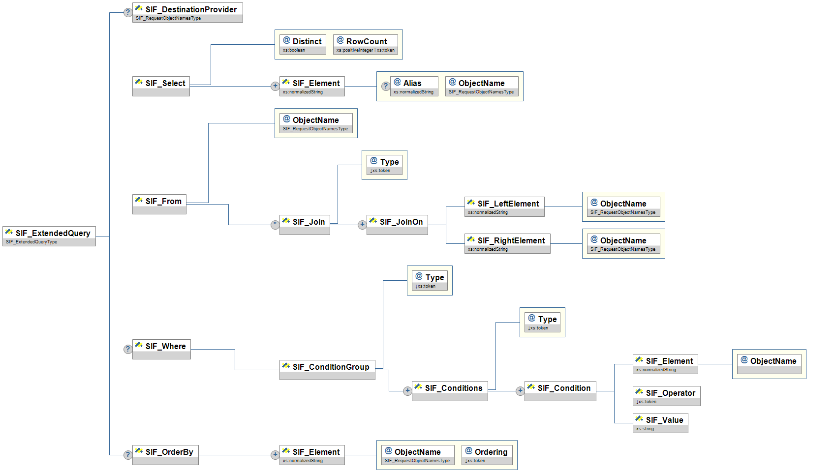 | SIF_QueryObject/SIF_Element | OR | Individual elements/attributes being requested of matching object. See SIF_Element Syntax below. If specified, only the elements/attributes requested are returned in the SIF_Response (with any parent elements/attributes); otherwise, all elements supported by the provider's object are returned. Note that this is a means to filter or select a subset of elements/attributes from a matching object; specifying elements/attributes here that do not occur in or are not supported in a matching object does not exclude that matching object from being returned. Include any existing parent elements/attributes of the elements/attributes that are requested but not present. | xs:normalizedString | |
