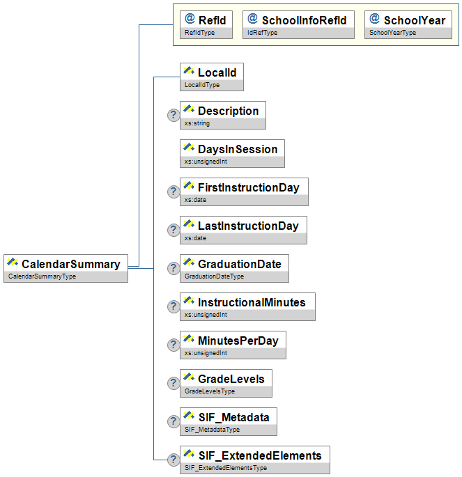 | CalendarSummary | This object provides a summary of a school's calendar information for a given school year. | |||