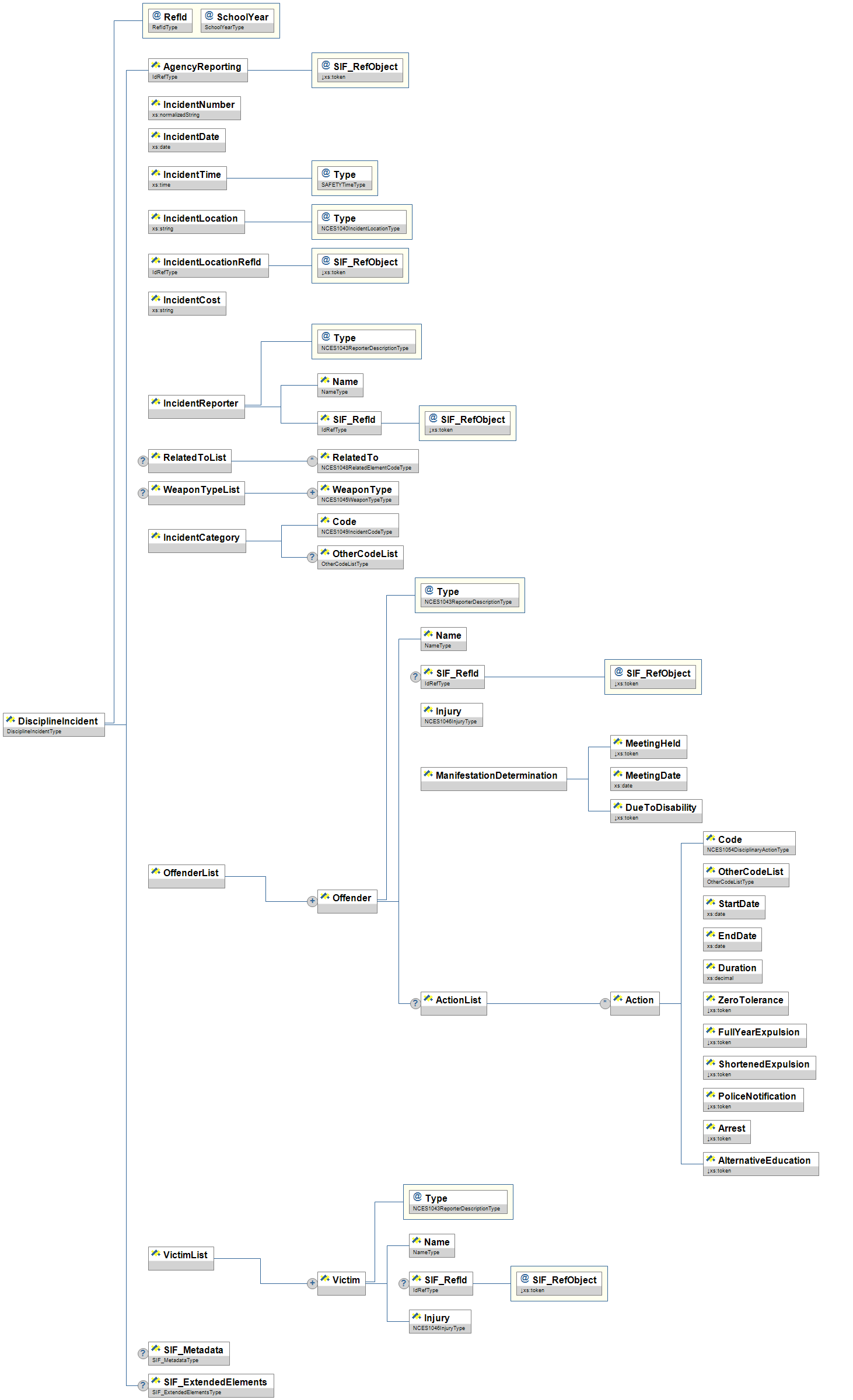 | DisciplineIncident | This object provides information on incidents involving violence, weapons, drugs, and other safety and discipline issues. | |||