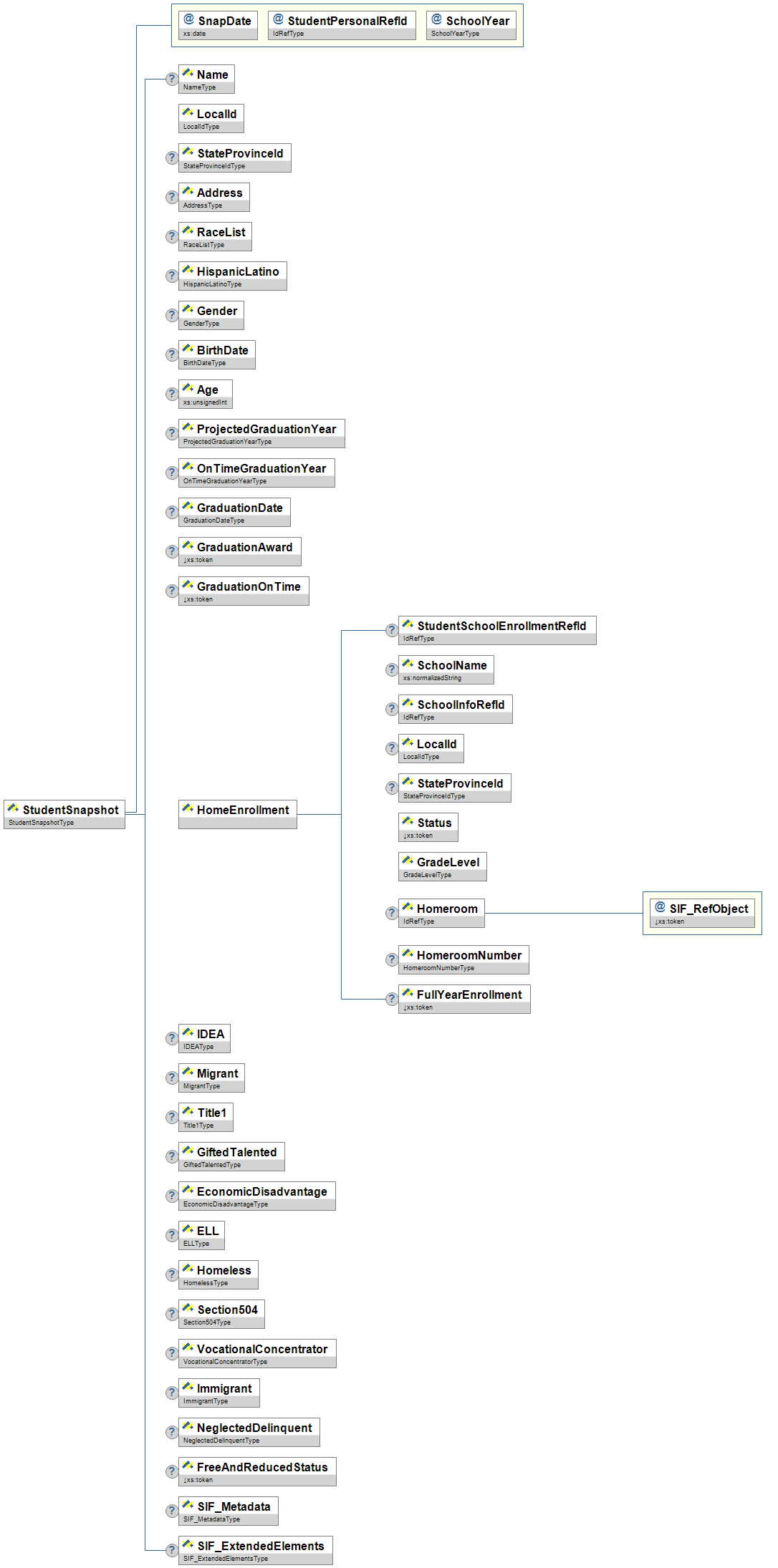 | StudentSnapshot | This object provides a snapshot of a student's record on a given day. All information reported in the object is reported as it appeared in the responding system on the date specified in SnapDate. It can be used for synching data across applications, for periodically loading a data warehouse, or for vertical reporting of data to a requesting authority, such as a state department of education. | |||