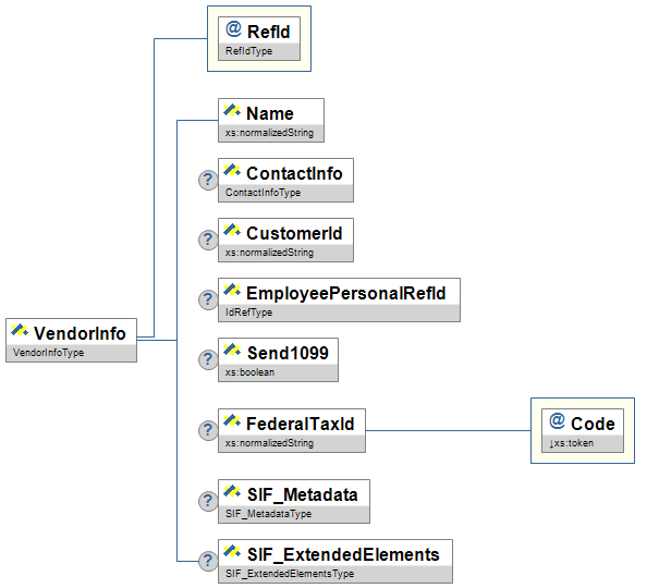 | EmployeePersonalRefId | O | When the vendor and employee are the same, it may be appropriate to link the EmployeePersonal records to the VendorInfo when tracking expense and tuition reimbursement. This is the GUID of the associated EmployeePersonal object. | IdRefType | |