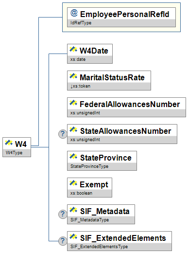 | W4 | This object contains the information completed on a W4 tax form. (Please note that this object is defined to represent the current deductions allowances for the employee; this is not intended to circumvent or replace IRS reporting standards but to faciliatate movement of W4 data from system to system within the LEA.) | |||