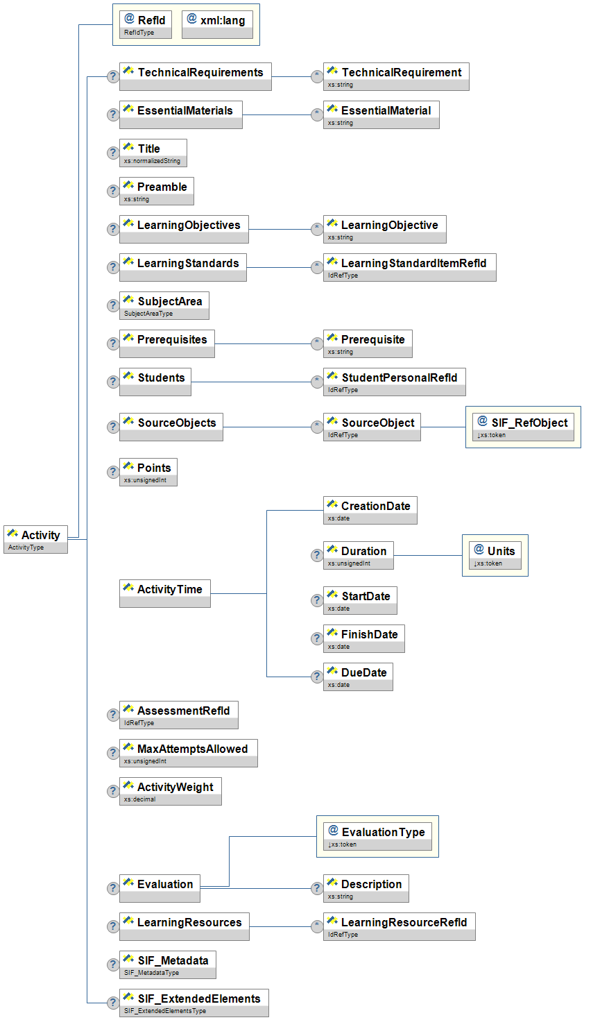 | AssessmentRefId | O | Link to the SIF Assessment object containing the evaluation information for this activity. | IdRefType | |