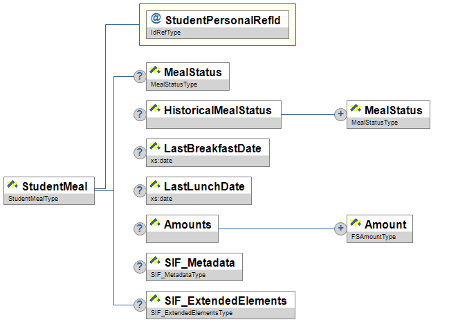 | StudentMeal | This object communicates the current meal/account status of a given student. This object will return information such as the amount of remaining breakfast/lunch credits, cash balance, meal status (free/reduced), etc. Systems may optionally support the historical reporting of a student's meal status (free/reduced). | |||