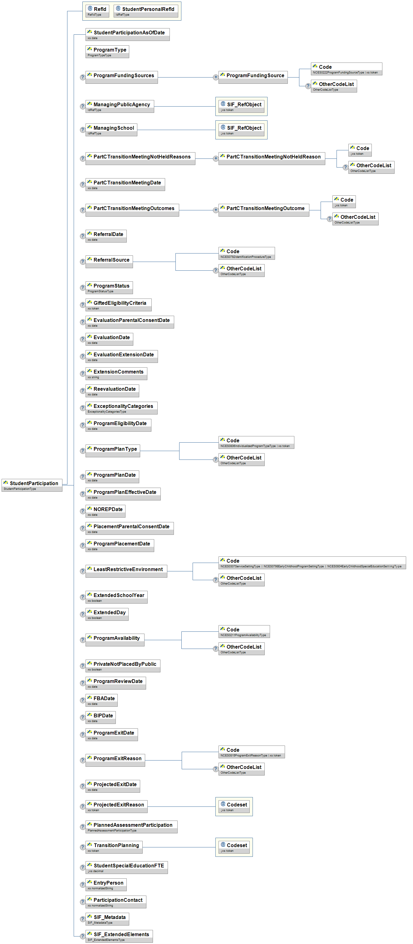 | StudentParticipation | This object contains information pertaining to student eligibility for and participation in an individualized special program such as special education, ESL, Section 504, etc.