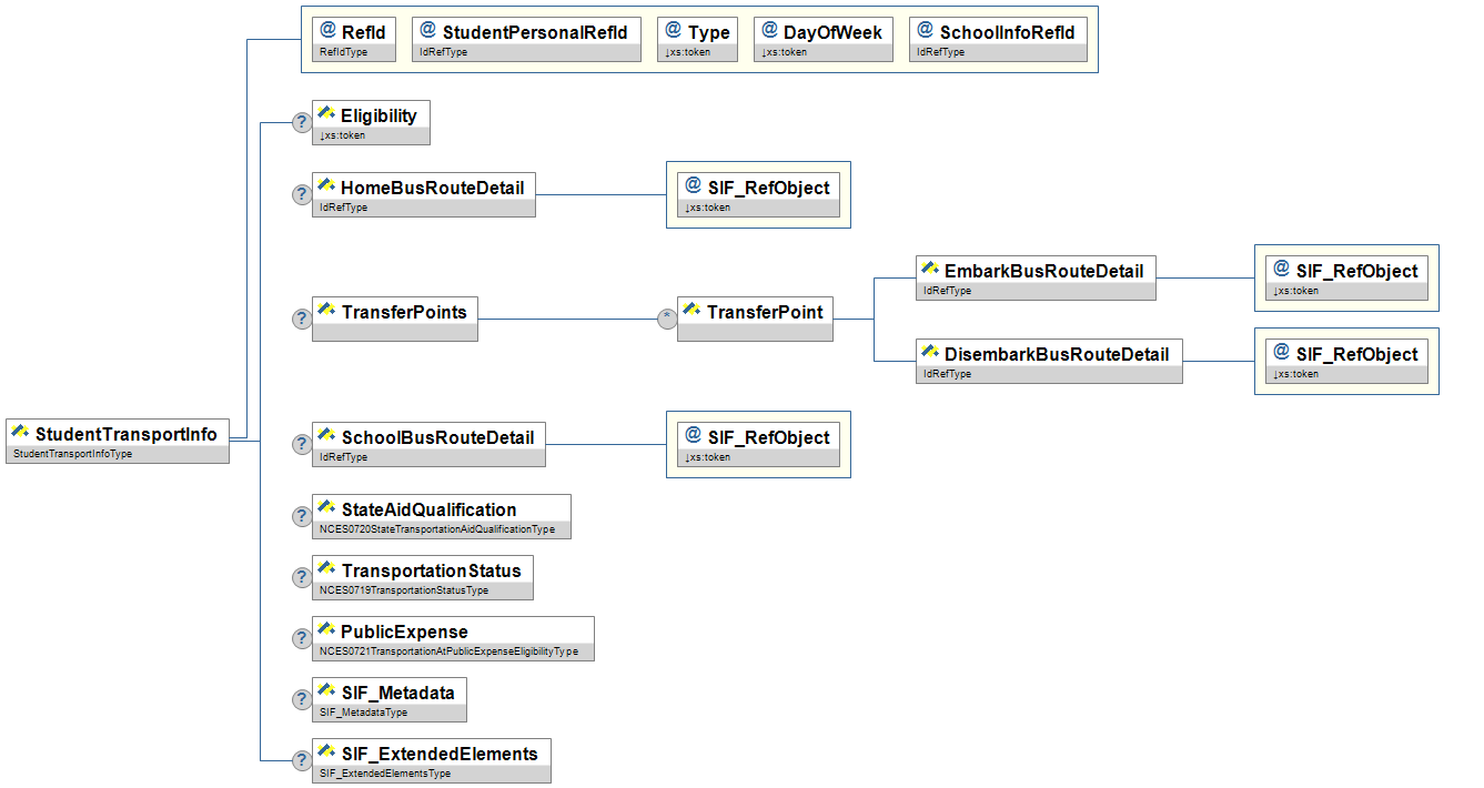 | TransferPoints/TransferPoint/ EmbarkBusRouteDetail | M | GUID that identifies the bus stop/route where the student gets on the bus. | IdRefType | |||