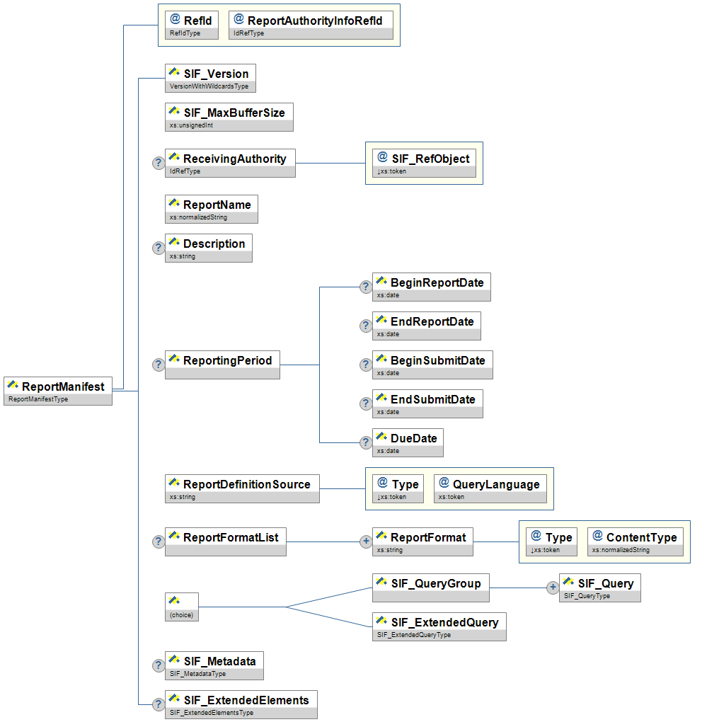 | ReportInfo | C | Identifies the manifest for the report and characteristics of the submission. This element is a conditional element. This element, the ReportData element, or the SIF_ExtendedQueryResults element is included but never more than one at the same time within an instance of this object. See examples of the usage of the object below. | ||