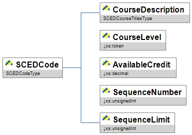 | CourseDescription | M | Five-digit number. Subject areas are represented by the first two digits, the last three digits specify a particular course within the subject area. | SCEDCourseTitlesType | |||||