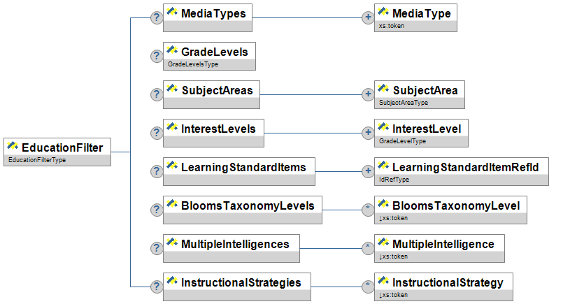 | BloomsTaxonomyLevels | O | This is a taxonomy of educational objectives based on three "domains:" Affective, Psychomotor, and Cognitive. For the purposes of assigning attributes to learning resources, the SIF specification is limited to the cognitive domain, including knowledge, comprehension, application, analysis, synthesis and evaluation. | List | |