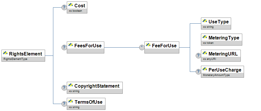| RightsElement | A common metadata element designed to carry any intellectual property or copyright information, based on the IEEE LOM Rights element [LOM]. | |||