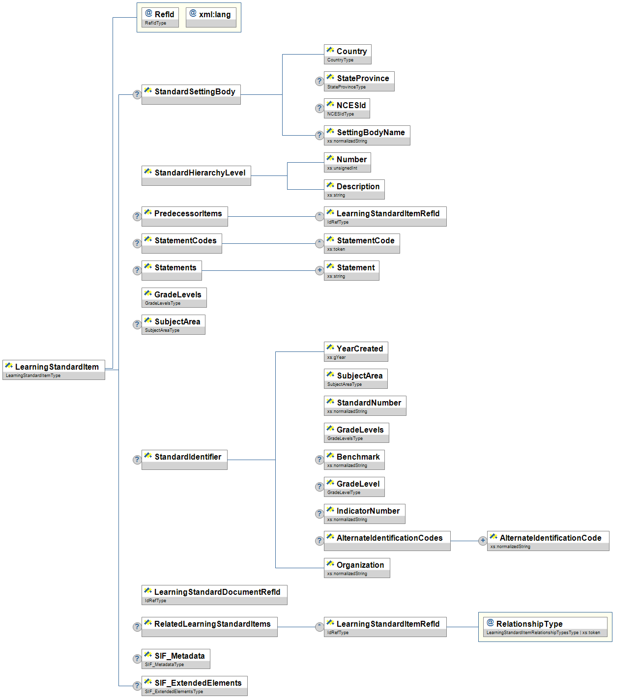 | RelatedLearningStandardItems/ LearningStandardItemRefId | OR | A relationship between the current standard item and another standard item. | IdRefType | |