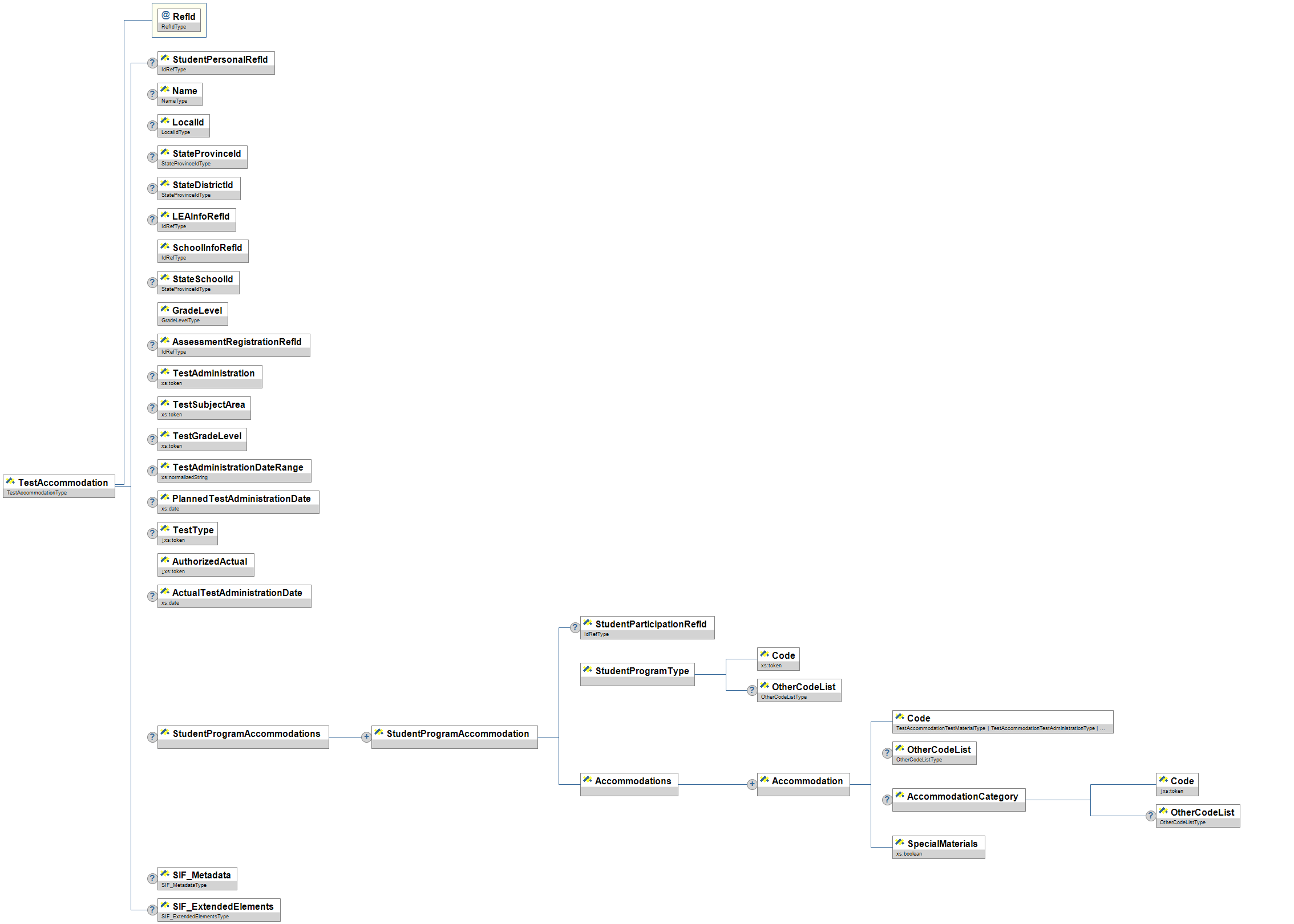 | TestAccommodation | This object provides information about test accommodation(s) required for a particular student who is registered to take a particular state test or who is about to be assigned by a teacher to take a course-related test, is participating in one or more special program(s) and for whom this set of test accommodations is prescribed in one or more specific special program plan(s). | |||