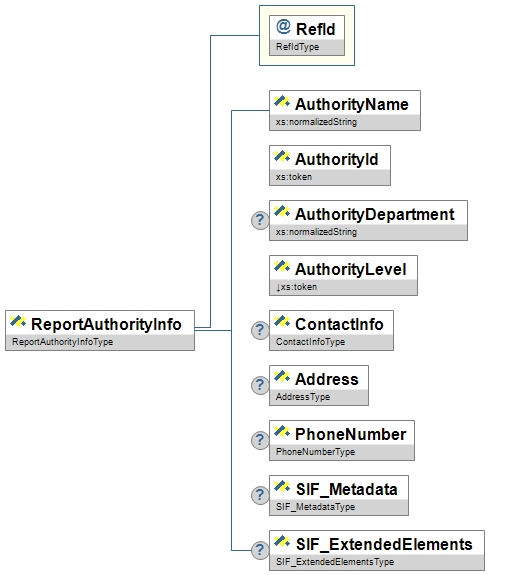 | ReportAuthorityInfo | This object contains information on authorities that provide ReportManifest objects and/or collect SIF_ReportObject objects, such as state departments of education, regional service agencies, or other report collecting agencies. | |||