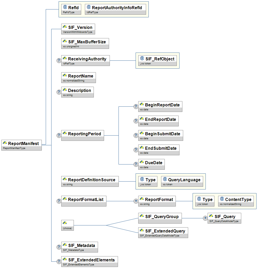 | ReportInfo | C | Identifies the manifest for the report and characteristics of the submission. This element is a conditional element. This element, the ReportData element, or the SIF_ExtendedQueryResults element is included but never more than one at the same time within an instance of this object. See examples of the usage of the object below. | ||
