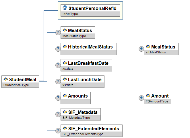 | StudentMeal | This object communicates the current meal/account status of a given student. This object will return information such as the amount of remaining breakfast/lunch credits, cash balance, meal status (free/reduced), etc. Systems may optionally support the historical reporting of a student's meal status (free/reduced). | |||
