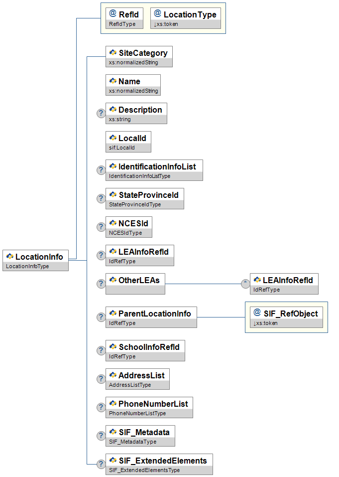 | ParentLocationInfo | O | A LocationInfo instance could be related to another LocationInfo. This element will help create that relation. | IdRefType | |