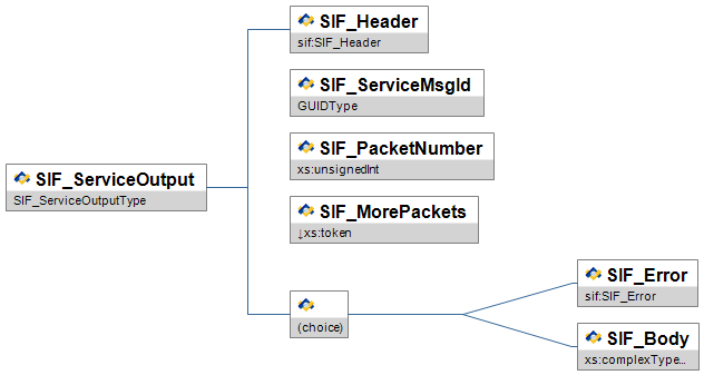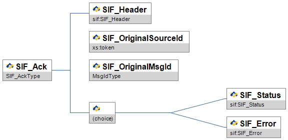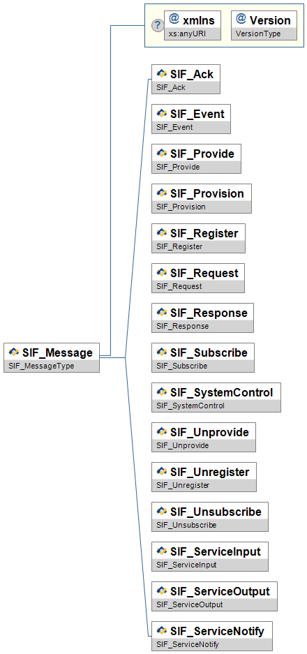 | SIF_Message | Contains one of the SIF message types. | choice of: SIF_Ack SIF_Event SIF_Provide SIF_Provision SIF_Register SIF_Request SIF_Response SIF_Subscribe SIF_SystemControl SIF_Unprovide SIF_Unregister SIF_Unsubscribe SIF_ServiceInput SIF_ServiceOutput SIF_ServiceNotify | ||
