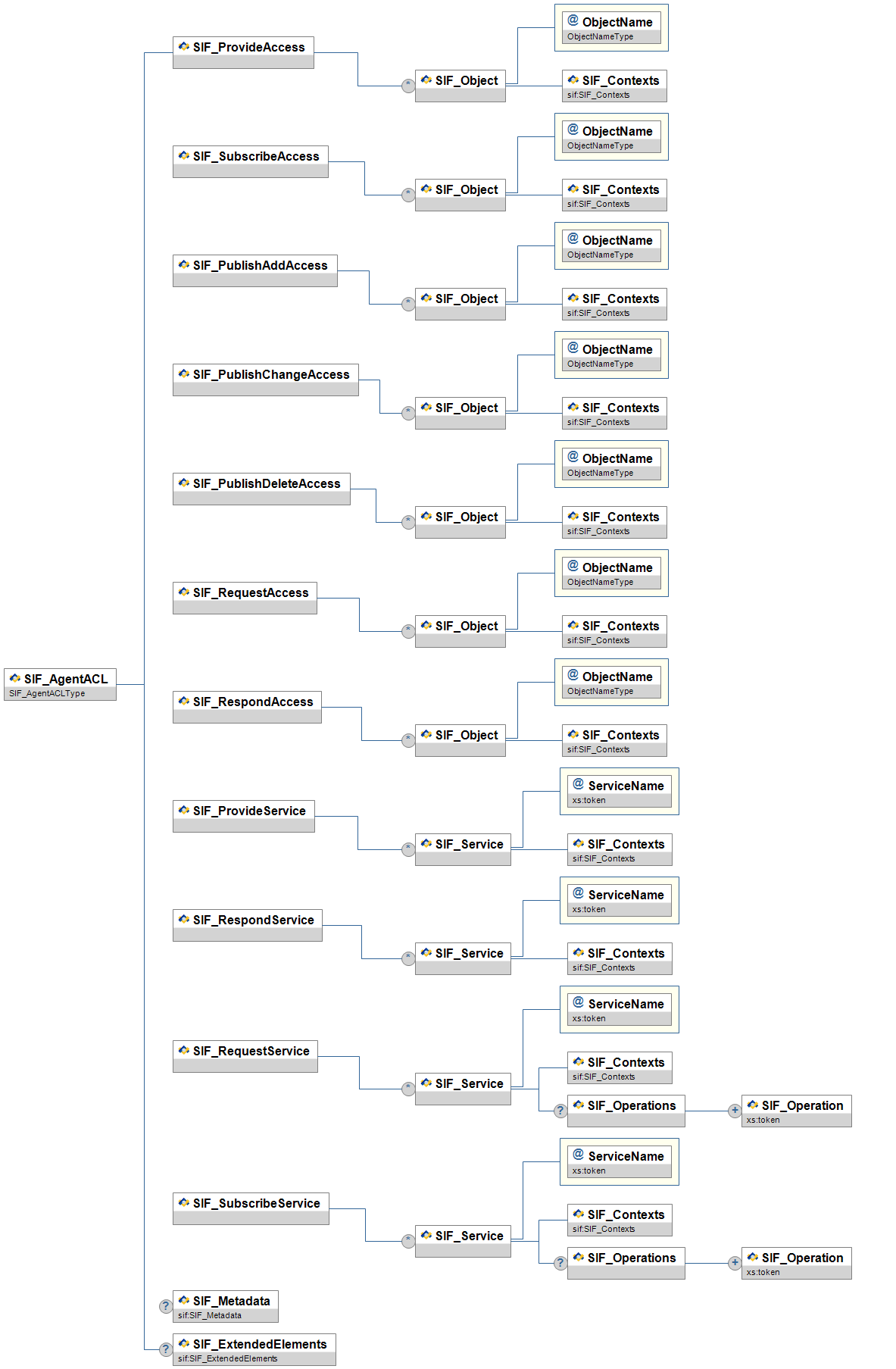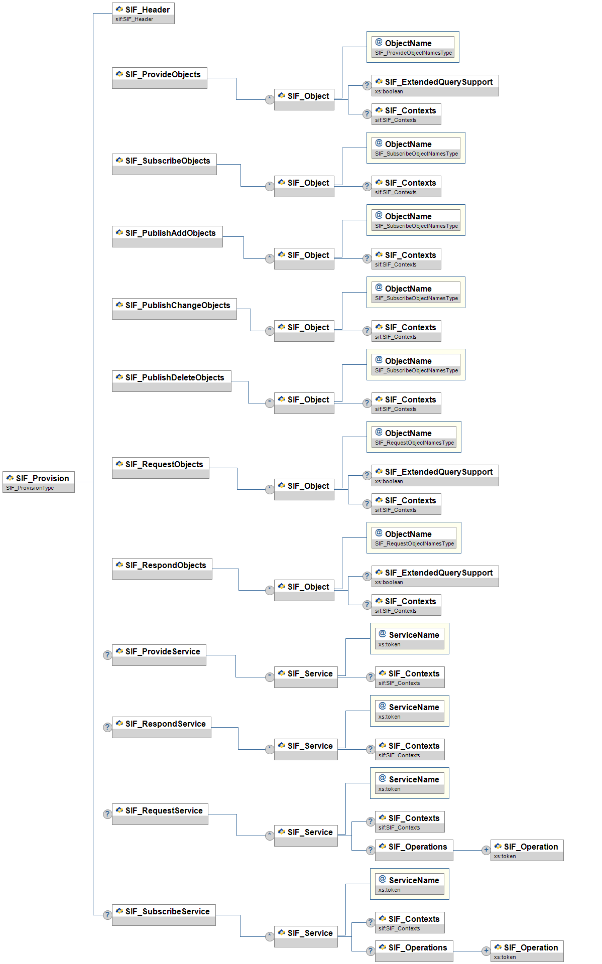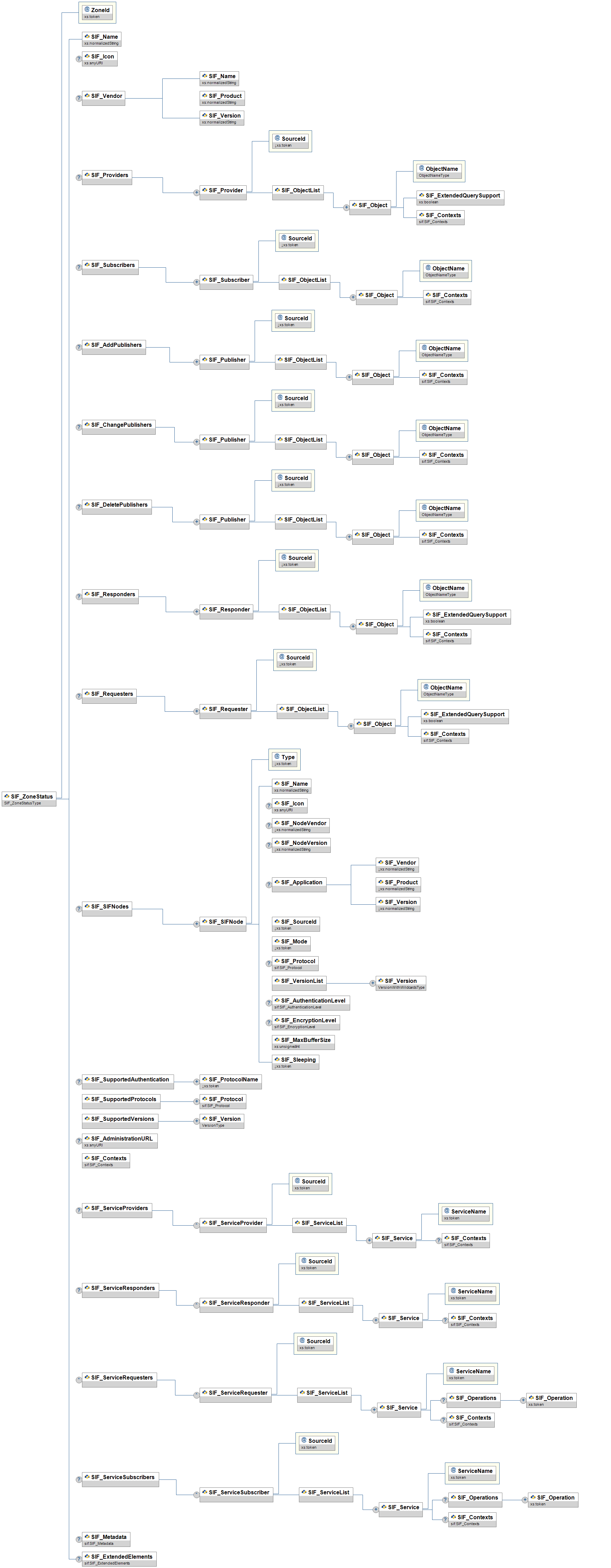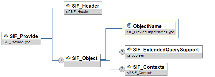 | SIF_ServiceProviders/SIF_ServiceProvider | OR | A list of nodes within a SIF Zone that provide one or more SIF Zone Services. The provider of a SIF Zone Service can be a SIF Agent or the Zone Integration Server (ZIS) itself. | ||||