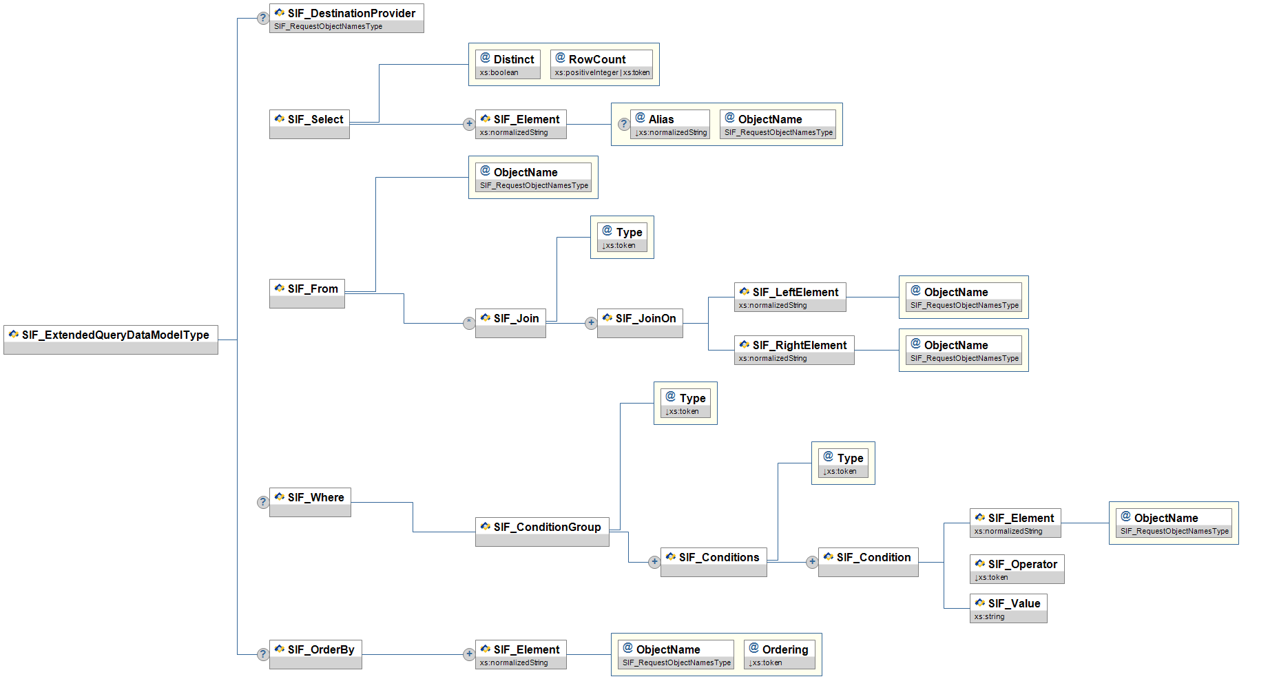 | SIF_ConditionGroup/SIF_Conditions/ SIF_Condition/SIF_Element | M | This is the element/attribute being queried. See below for syntax. | xs:normalizedString | |