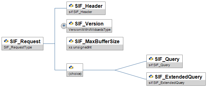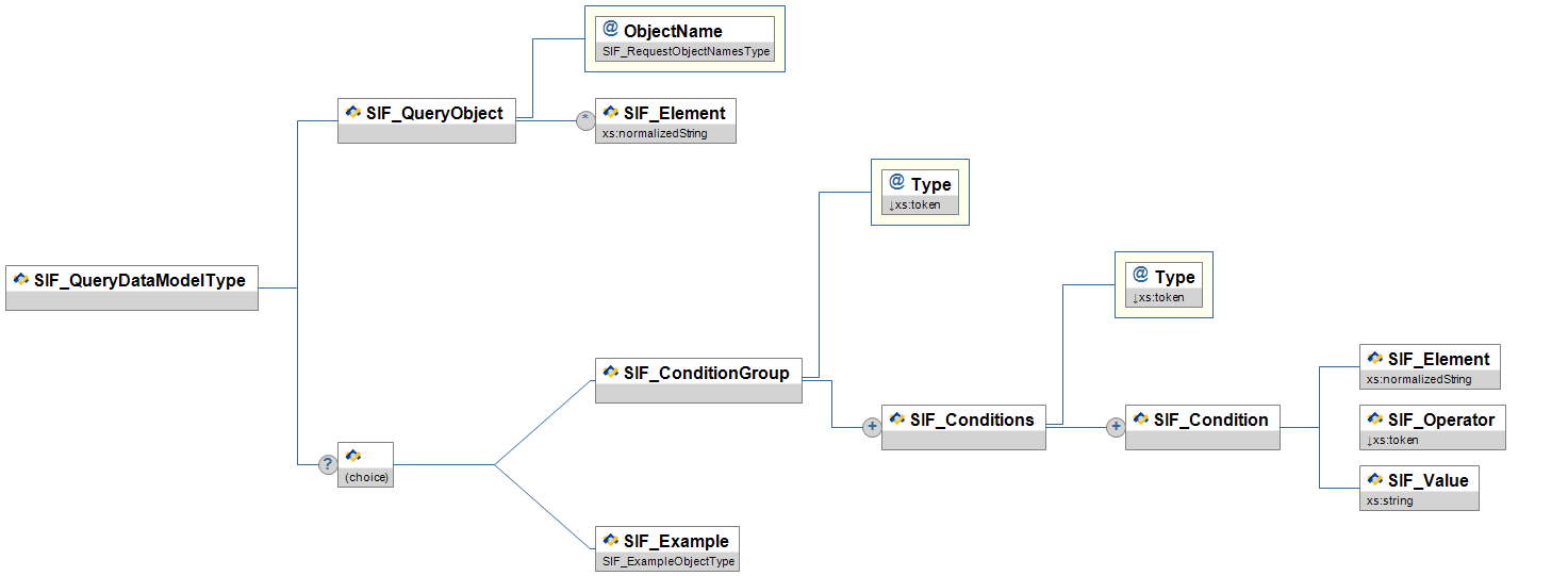 | SIF_Query | SIF's default query mechanism. Note: With SIF Implementation Specification version 2.4 the choice element depicted in the diagram below has changed. In the XSD files, the choice element used to be rendered as a sequence of optional elements. Now, in the XSD files, the choice element is rendered as an xs:choice. This may cause problems with agents that treat the choice element as two optional elements rather than a choice of one and only one of the choices. | |||