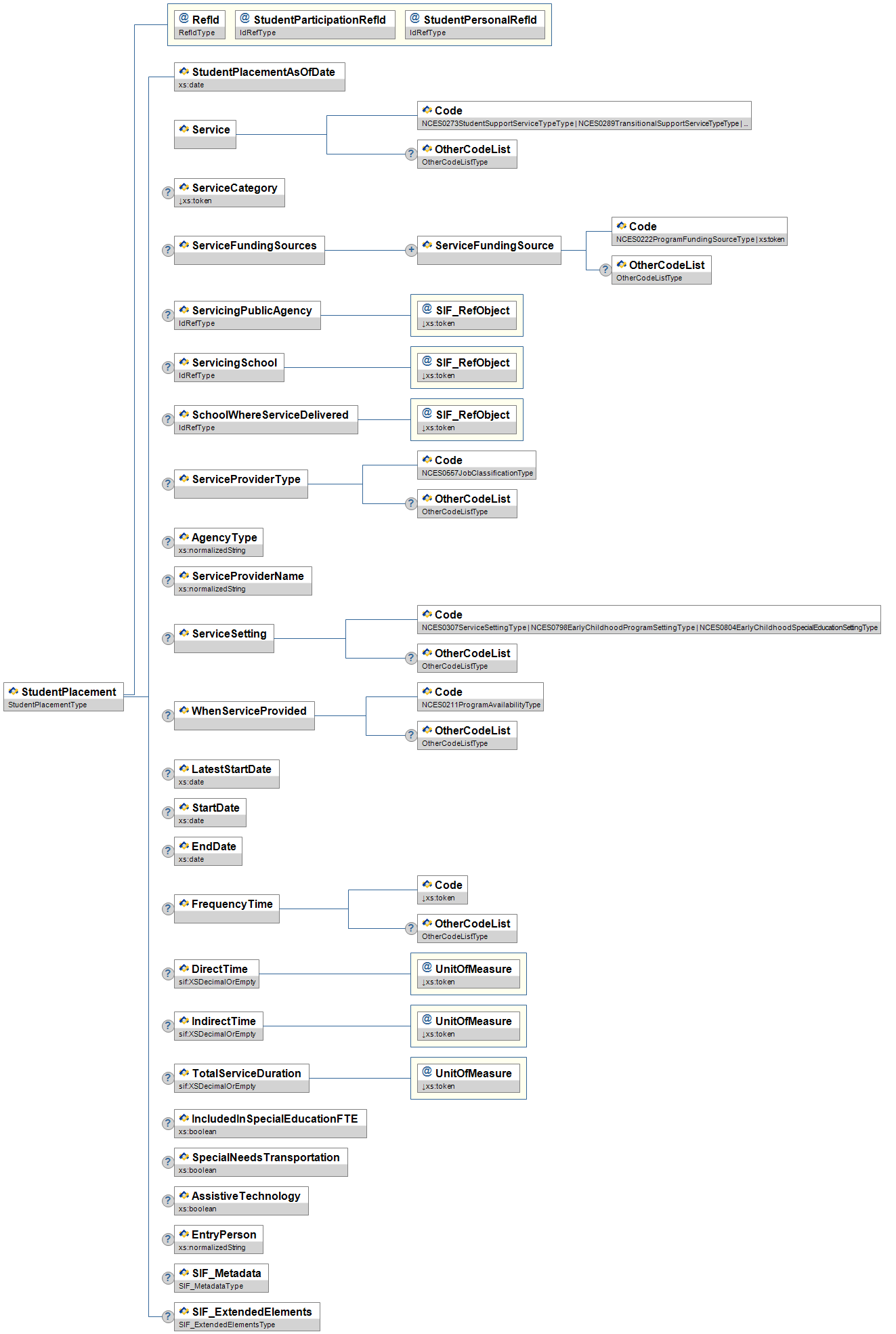 | StudentPlacementList | O | This list contains information that describes each specific instructional, related or transitional service that has been prescribed or recommended in the program plan developed for a student who has been placed in an individualized special program. | List | |||||||