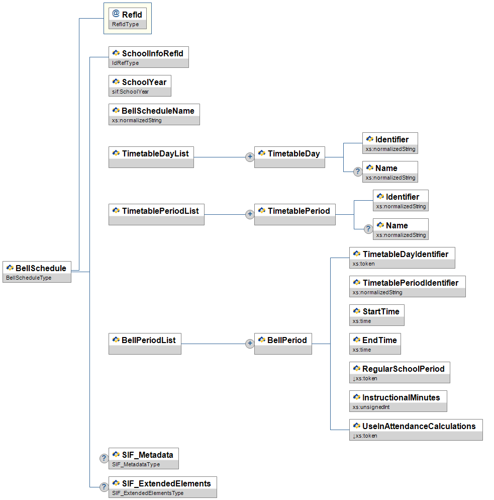 | BellScheduleName | M | A name that uniquely identifies a particular BellSchedule from others for the same school and year. | xs:normalizedString | |