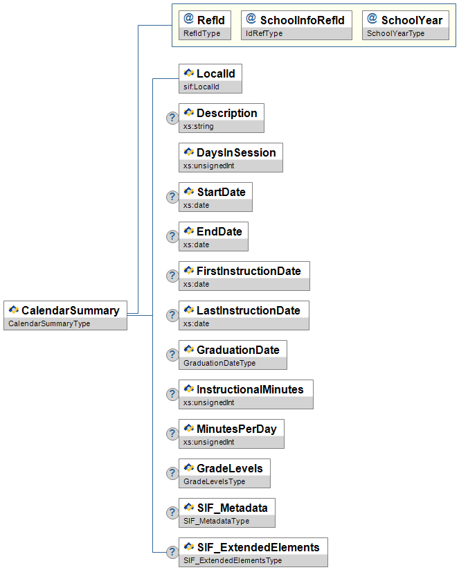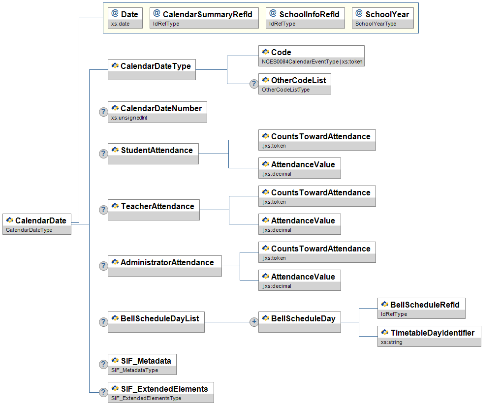 | CalendarDate | This object defines information related to a school calendar day in a given school calendar year. If both CalendarDate and CalendarSummary objects are supported, there must be an instance of this object for each date between CalendarSummary StartDate and EndDate, inclusive. | |||||||||