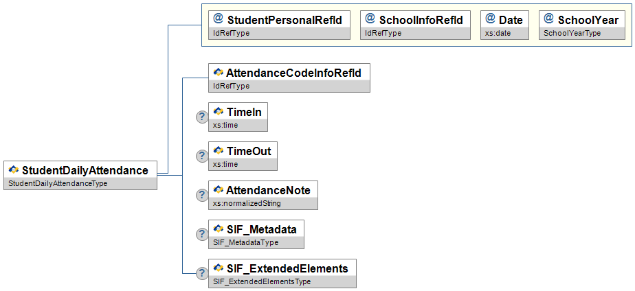 | @ | SchoolInfoRefId | M | The Id (GUID) that identifies the school where the attendance code is used. | IdRefType | ||||