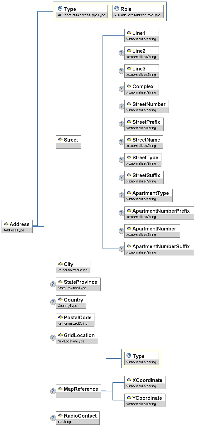 | @ | Type | M | Code that defines the location of the address. Note: A subset of specific valid values for each instance in a data object may be listed in that object. | AUCodeSetsAddressTypeType |