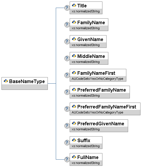 | PreferredFamilyNameFirst | O | An indicator used to identify the naming conventions used by some predominantly non-European, ethnic or language groups and related to the display nature of a name. | AUCodeSetsYesOrNoCategoryType | |