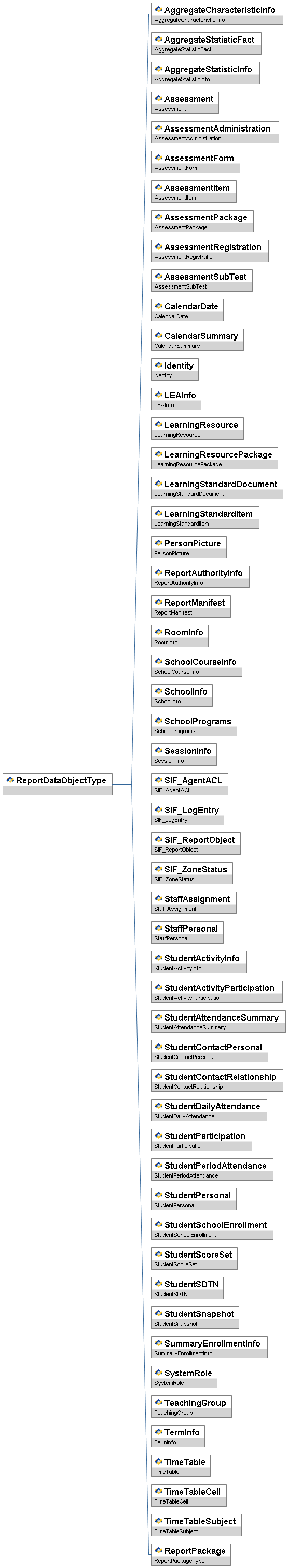 SIF_ReportObject/ReportData, plus ReportPackage. When this infrastructure type is implemented with a data model, the enumeration will contain the appropriate objects from that data model.Figure A.15-1: ReportDataObjectTypeTable A.15-1: ReportDataObjectTypeAbstractContentPackageType. ReportPackage