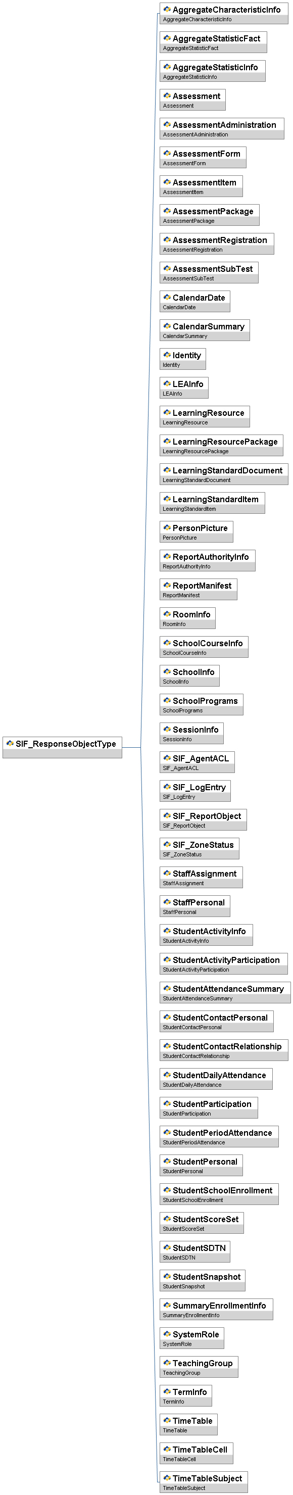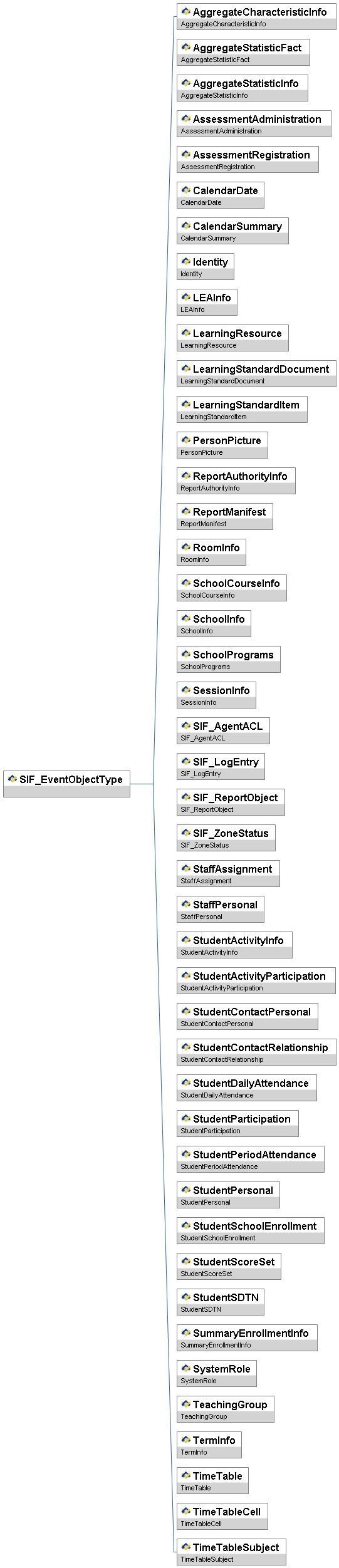 | SIF_EventObjectType | The SIF objects that can be included in a SIF_Event message. When this infrastructure type is implemented with a data model, the enumeration will contain the appropriate objects from that data model. | choice of: AggregateCharacteristicInfo AggregateStatisticFact AggregateStatisticInfo AssessmentAdministration AssessmentRegistration CalendarDate CalendarSummary Identity LEAInfo LearningResource LearningStandardDocument LearningStandardItem PersonPicture ReportAuthorityInfo ReportManifest RoomInfo SchoolCourseInfo SchoolInfo SchoolPrograms SessionInfo SIF_AgentACL SIF_LogEntry SIF_ReportObject SIF_ZoneStatus StaffAssignment StaffPersonal StudentActivityInfo StudentActivityParticipation StudentContactPersonal StudentContactRelationship StudentDailyAttendance StudentParticipation StudentPeriodAttendance StudentPersonal StudentSchoolEnrollment StudentScoreSet StudentSDTN SummaryEnrollmentInfo SystemRole TeachingGroup TermInfo TimeTable TimeTableCell TimeTableSubject |