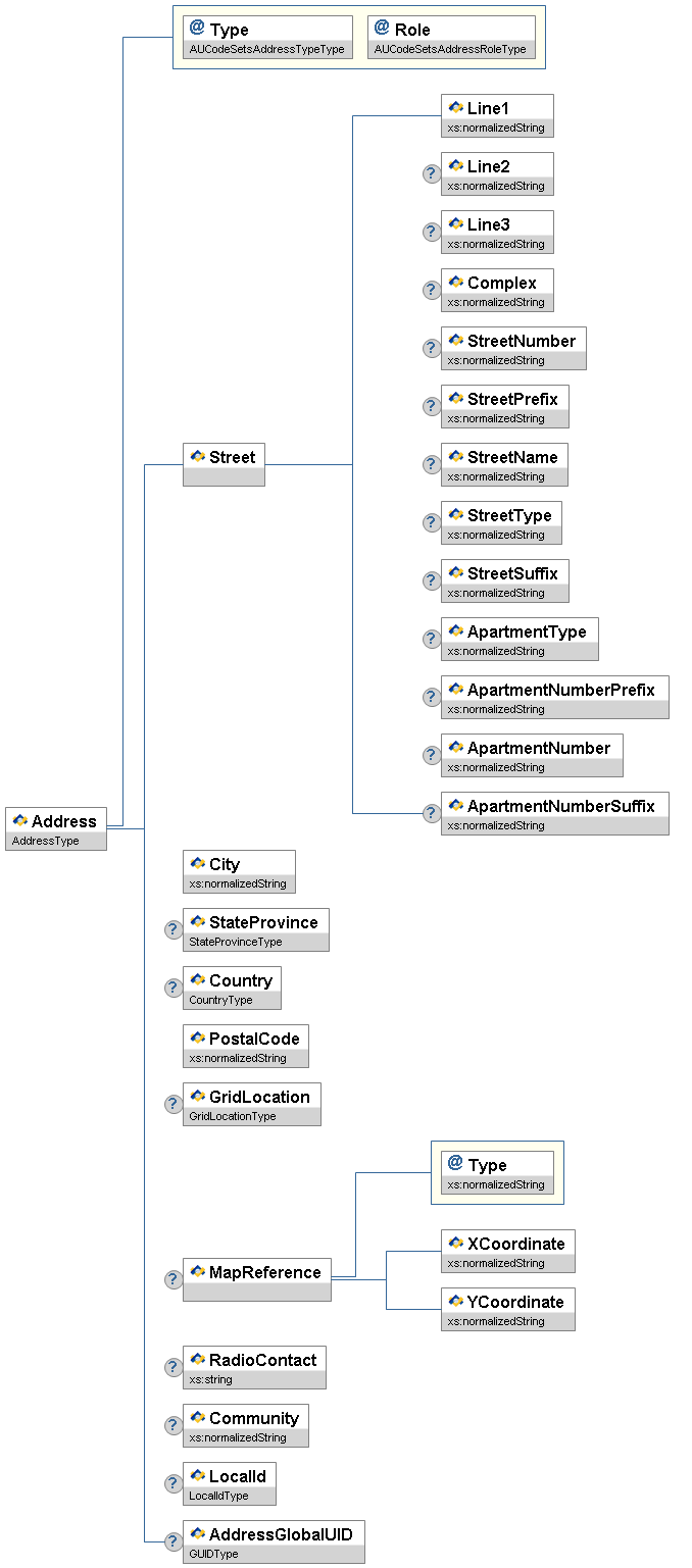 | @ | Type | M | Code that defines the location of the address. Note: A subset of specific valid values for each instance in a data object may be listed in that object. | AUCodeSetsAddressTypeType |
