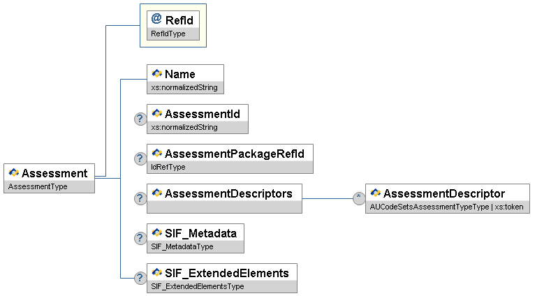 | AssessmentDescriptors/AssessmentDescriptor | OR | union of: AUCodeSetsAssessmentTypeType additional values: