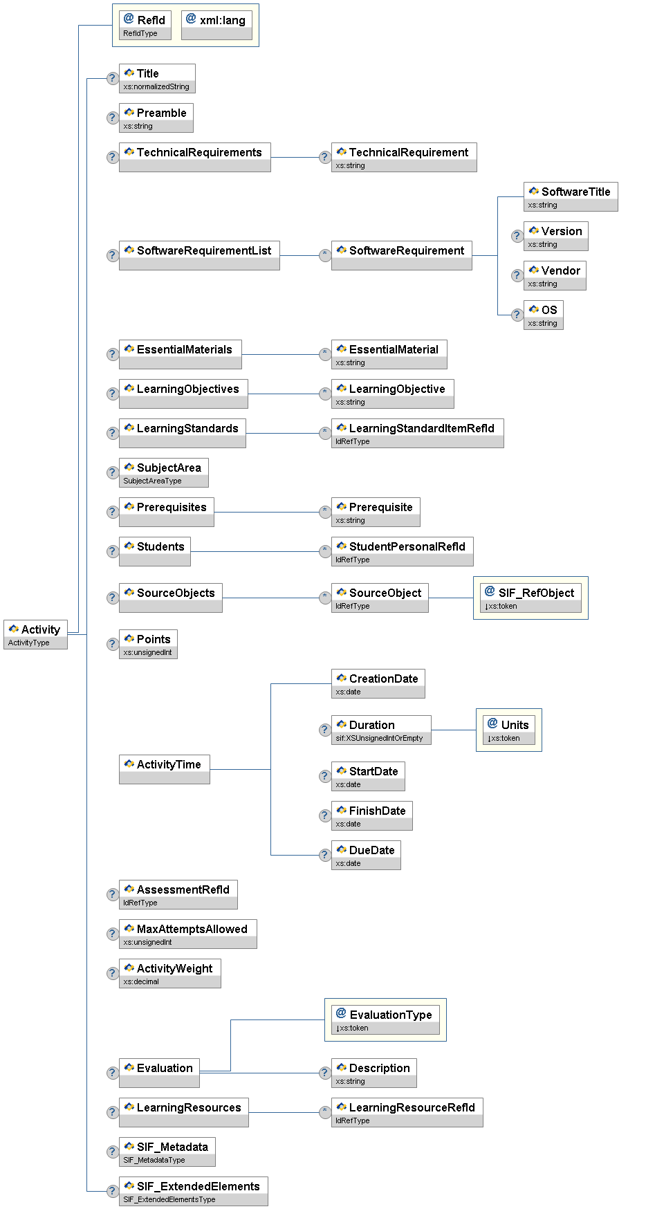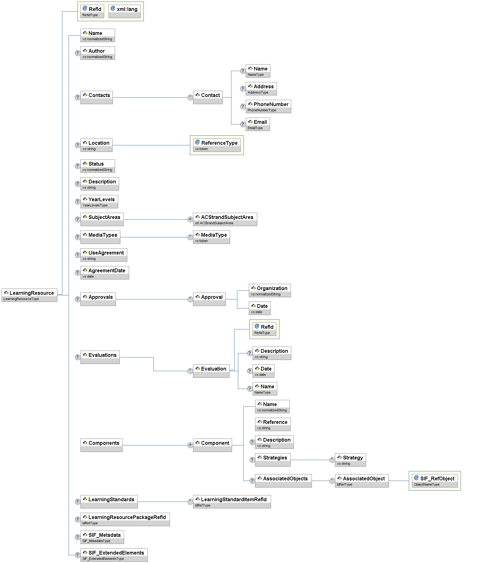 | LearningResources/LearningResourceRefId | OR | A GUID reference to a SIF LearningResource object that supports this activity | IdRefType | |