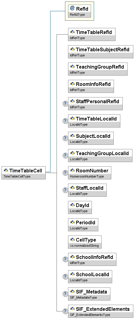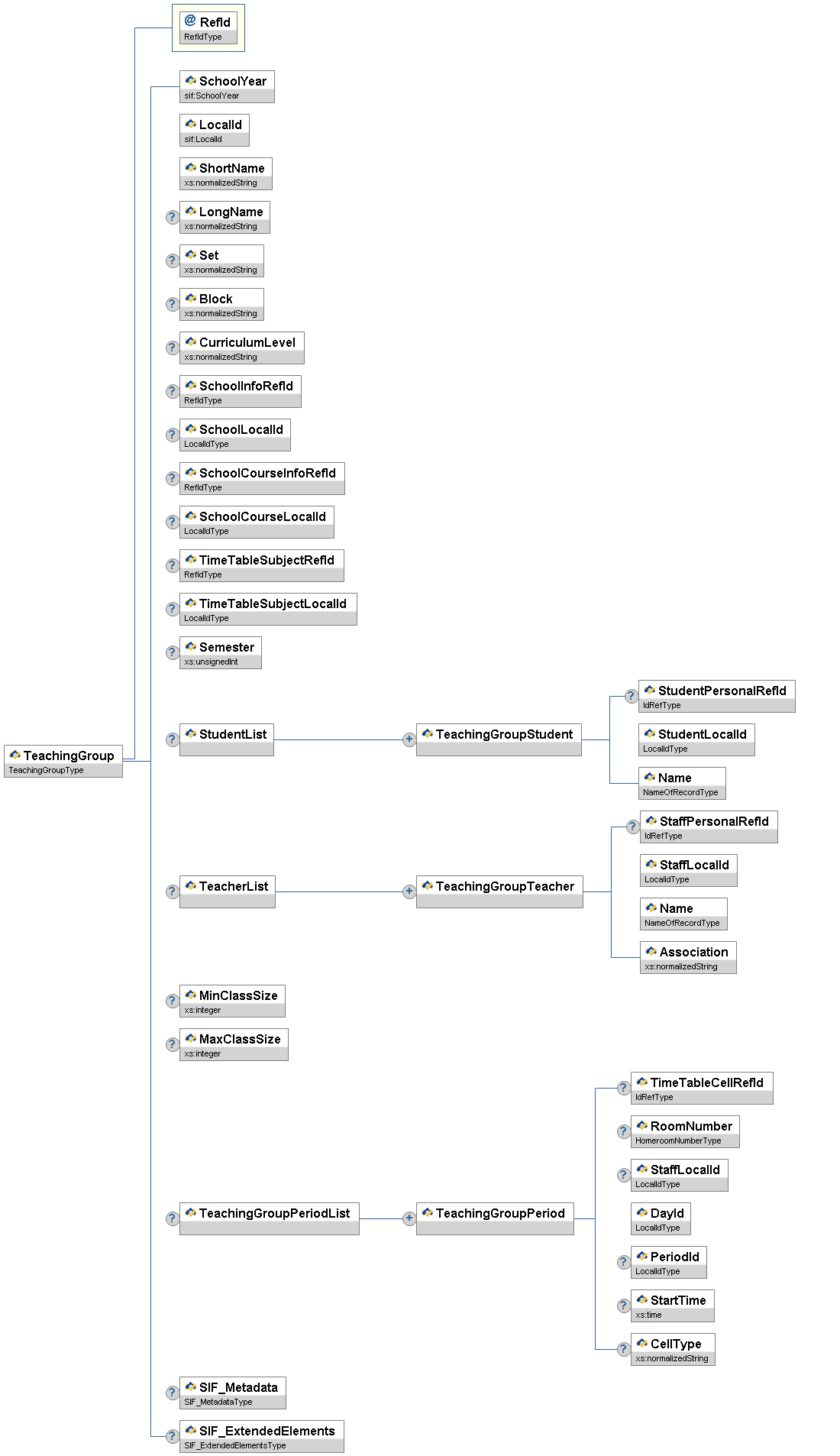 | TeachingGroupPeriodList/TeachingGroupPeriod/ TimeTableCellRefId | O | If the TimeTableCell has been previously published, this reference can be provided as a connection to more detailed schedule information. | IdRefType | |