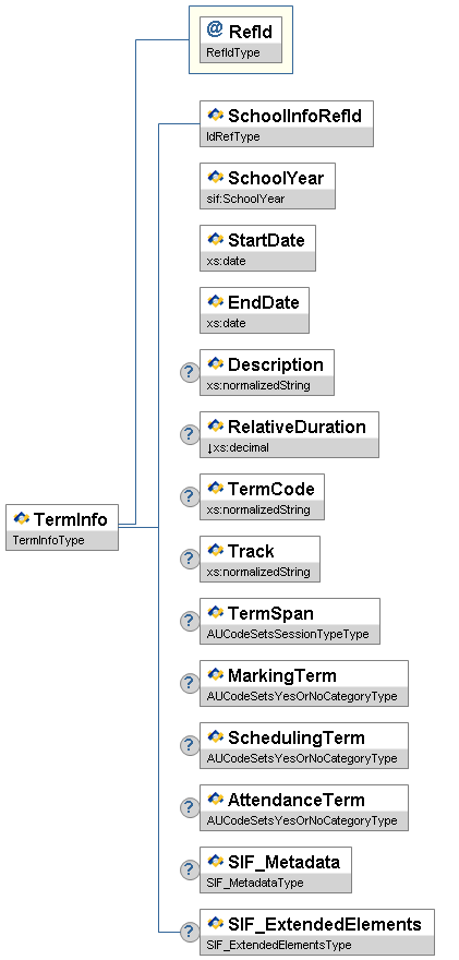 | MarkingTerm | O | Does this TermInfo represent a marking period? | AUCodeSetsYesOrNoCategoryType | |||||||