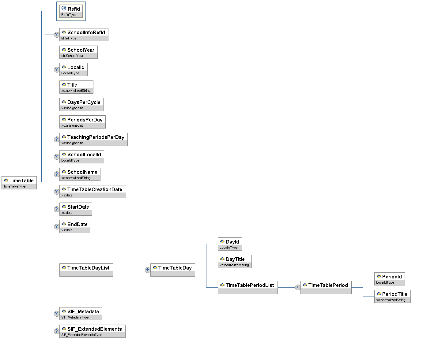 | TimeTable | The purpose of this object is to define a schedule or Time Table structure/skeleton for the school. The Time Table is produced by the Time Tabling software. Once the Time Table is produced, the time tabling software creates the schedule based on business rules and constraints to fit into the time table structure. The proposed Time Table object is based on a combination of the proposed UK B6 – Timetable Cycle Object and Timetable Scope Object. The Time Table is identified uniquely in the SIF Zone by its' GUID, School and School Year. A Time Table is linked to a particular school. All local ids in non-authoritative objects are optional. It is therefore up to the provider and the actual agent's design and choreography to determine whether or not to use or local ids from parent objects. There are cases in some subscribing systems where it might not possible to add RefId columns and therefore the RefId of related objects cannot be stored. For example a target system that listens to TimeTableSubject events and updates them may not be able to store the associated SchoolCourseInfoRefId with that object. The only way it can link the TimeTableSubject object with the appropriate course might be through its local course id. Having local ids that link the parent objects with the child object can simplify the agent design. Generally it is suggested to use the appropriate RefIds whenever possible and only use local ids if there is no other way to use RefIds. | |||