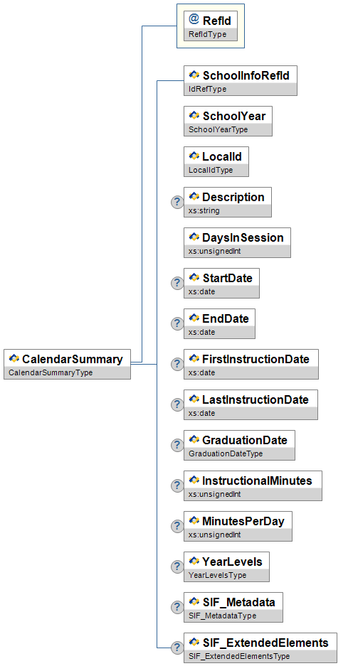 | CalendarDate | This object defines information related to a school calendar day in a given school calendar year. If both CalendarDate and CalendarSummary objects are supported, there must be an instance of this object for each date between CalendarSummary StartDate and EndDate, inclusive. | |||