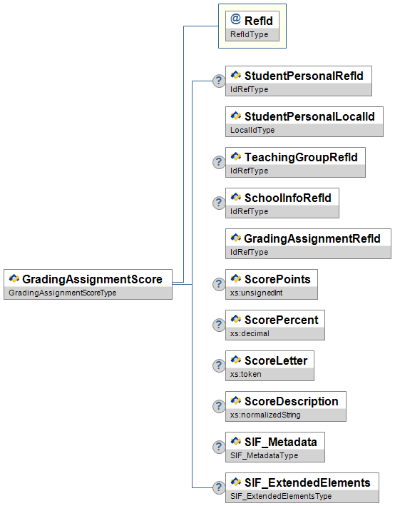 | AssessmentRefId | O | Link to the SIF Assessment object containing the evaluation information for this activity. | IdRefType | |