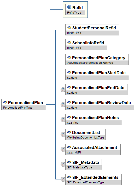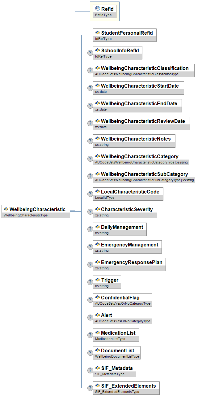| WellbeingCharacteristicCategory | O | Category of WellbeingCharacteristic. | union of: AUCodeSetsWellbeingCharacteristicCategoryType xs:string | |
