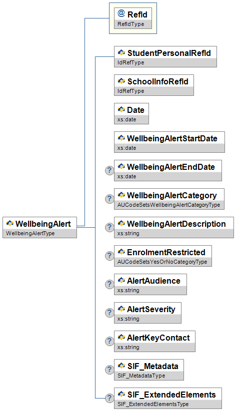 | WellbeingAlertCategory | C | Category of WellbeingAlert. | AUCodeSetsWellbeingAlertCategoryType | |