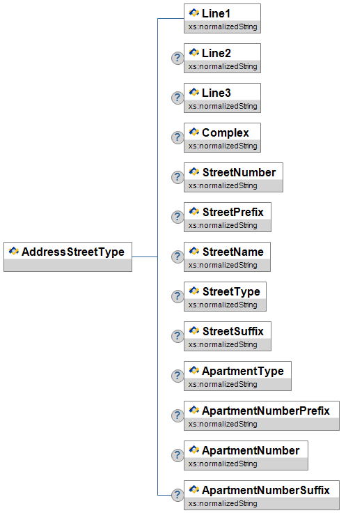 | StreetType | O | The type of street. For example, Lane, Blvd., Ave., etc. | xs:normalizedString | |
