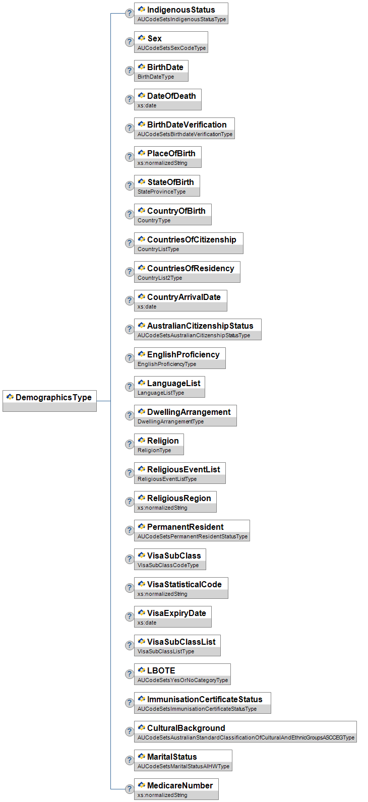 | VisaSubClassCodeType | O | Visa Sub-Class - Can be free text - not necessary to validate | union of: AUCodeSetsVisaSubClassType xs:string |